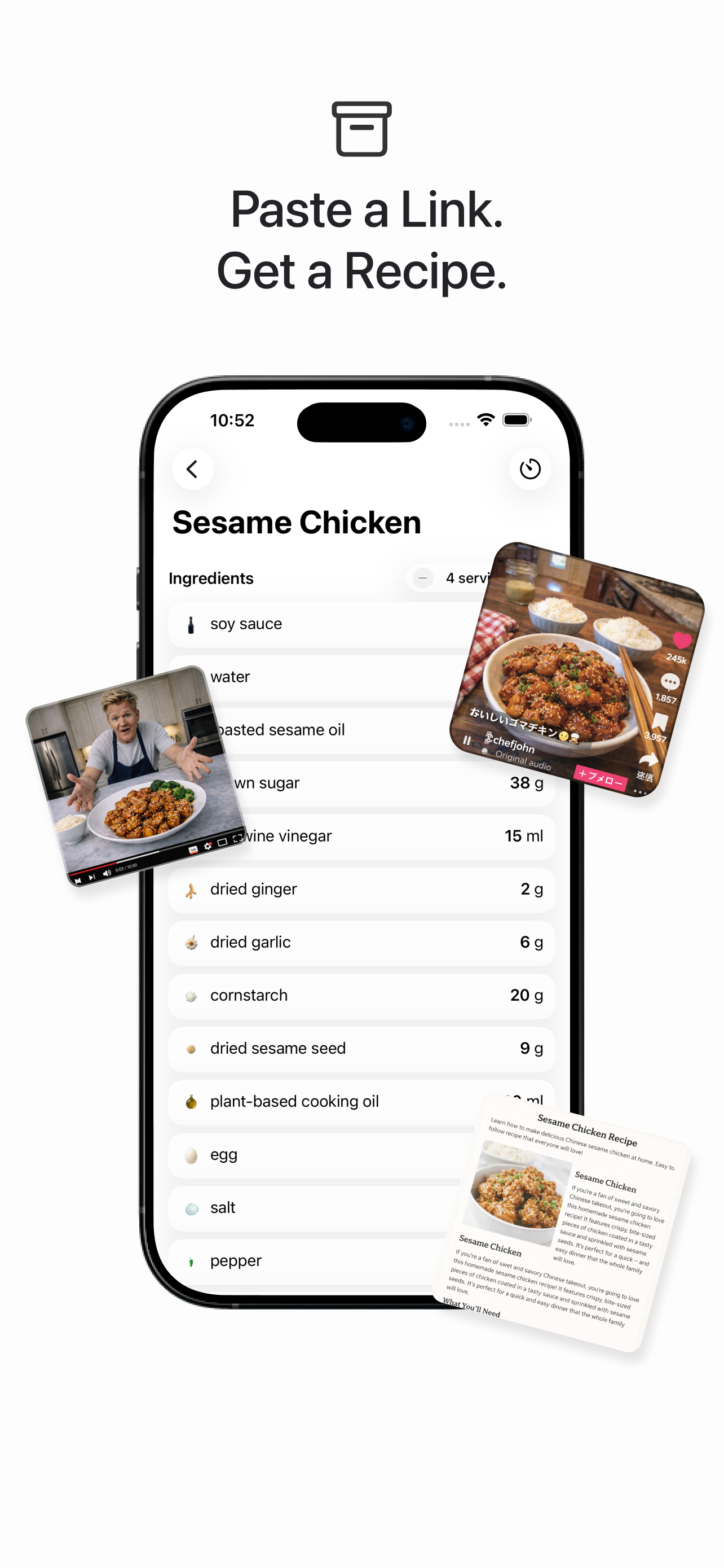 RecipeAI saves recipes from any link. TikTok, YouTube, Instagram, blogs, and more. Share a link from any app and RecipeAI extracts the full recipe: ingredients with quantities, step-by-step instructions, nutrition info, and smart serving sizes. No blog preambles, no ads.